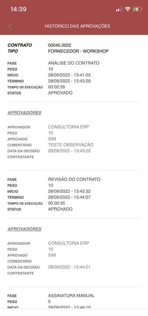 3. Histórico de Aprovações – na tela do celular, as partes conseguem verificar o status dos contratos e, se houver assinatura entre etapas, podem conferir quem foi o responsável por fazê-la.